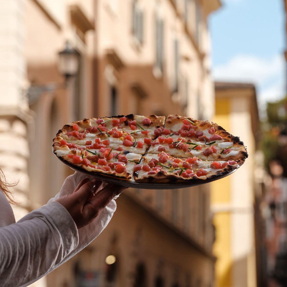 "Ristorante - pizzeria situato nel centro storico di Roma. Come intuibile dal nome, ma meglio specificarlo per eventuali turisti meno esperti, il locale offre pizza tipica della tradizione romana: sottile e niente cornicione. Noi, pur essendo in due, abbiamo ordinato tre pizze, proprio in virtù della leggerezza della tipologia proposta. La margherita soprattutto è veramente molto leggera per cui, pur avendola trovata molto buona, non la consiglierei come portata principale. Abbiamo concluso la cena con delle palline fritte ripiene di crema (su nostra scelta dato che è presente anche la versione alla nutella). Esteticamente il locale è molto moderno all'interno e molto carino all'esterno data la posizione nei tipici vicoli di Roma centro. Personale molto gentile e simpatico. Relativamente al prezzo, abbiamo pagato il giusto per l'esperienza e la posizione."